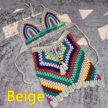 - Three-piece set: Crochet cover-up, bra top with a T-back, and mini skirts for a coordinated beach look.